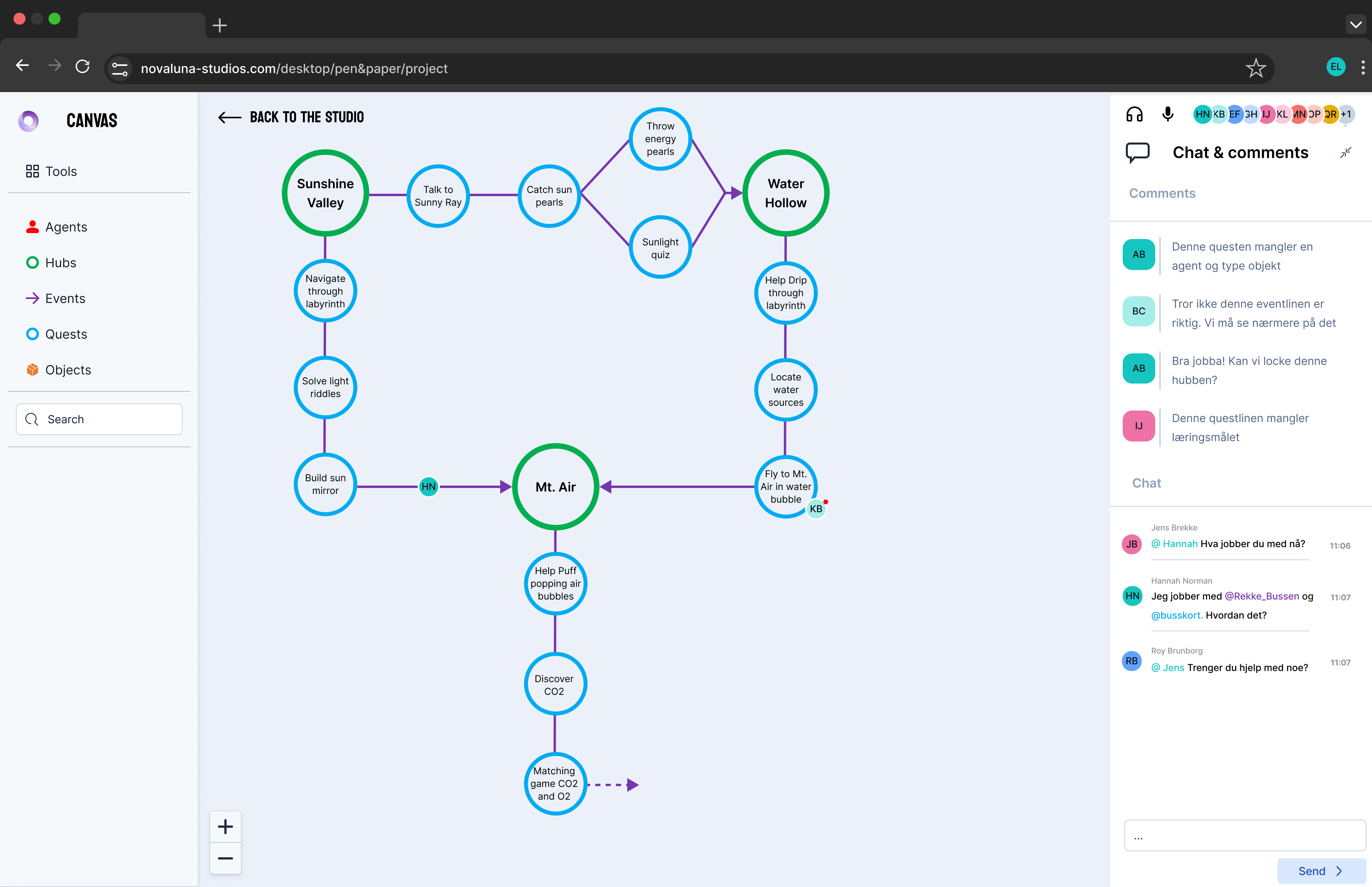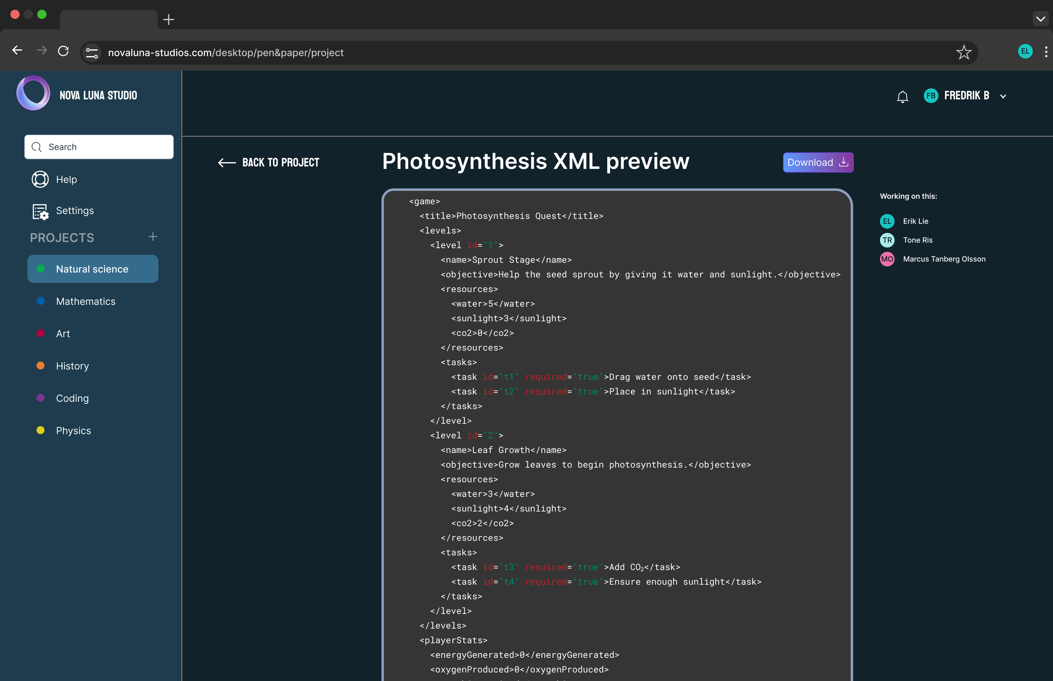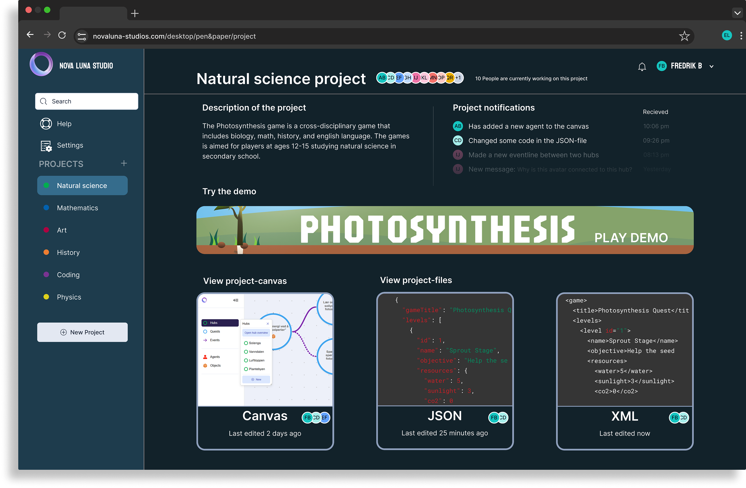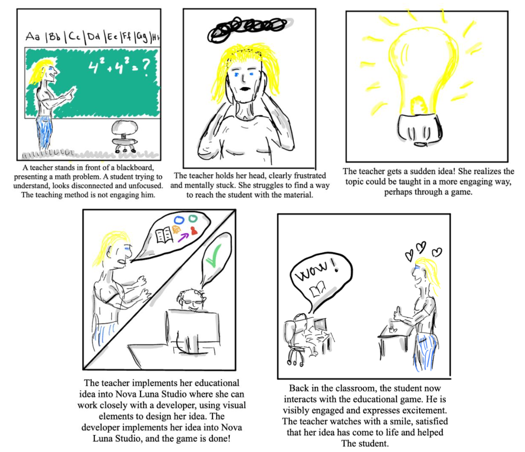 Nova Luna Studio supports five core features. The platform supports two creation pathways, one offering a fully digital workflow, and the other providing a pen & paper option that enables teachers to run workshops before formalizing their ideas in the digital tool. This dual pathway supports flexibility and meets teachers where they are, whether they prefer digital tools or traditional methods. A collaborative canvas using eLuna’s visual language, making it intuitive for teachers to map out stories, characters, and challengers. Exportable XML/JSON files that serve as exportable blueprints for the developers. A demo game that is updated when the developers push new code. This is to show progress and to foster testing in classrooms. An informative landing page where users can see live notifications on projects, information about the projects, and who the collaborators are. You can read more aboud the final solution here.