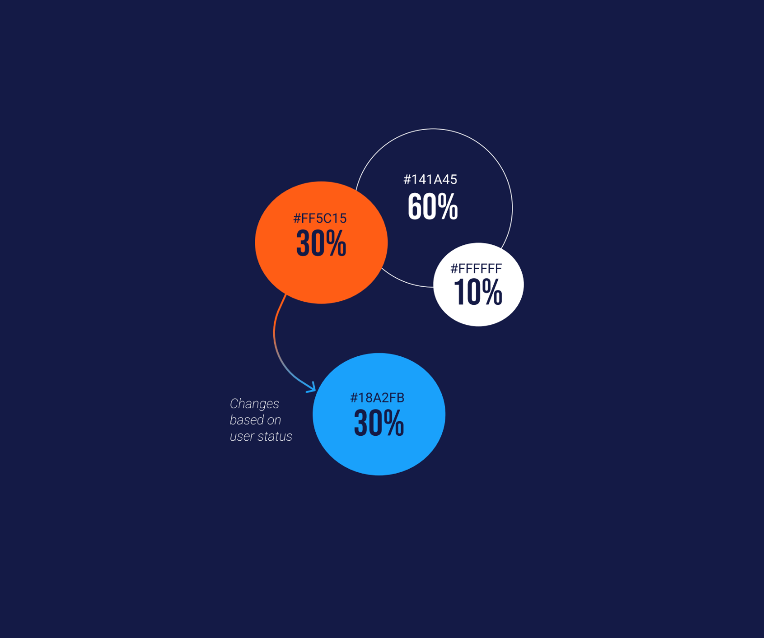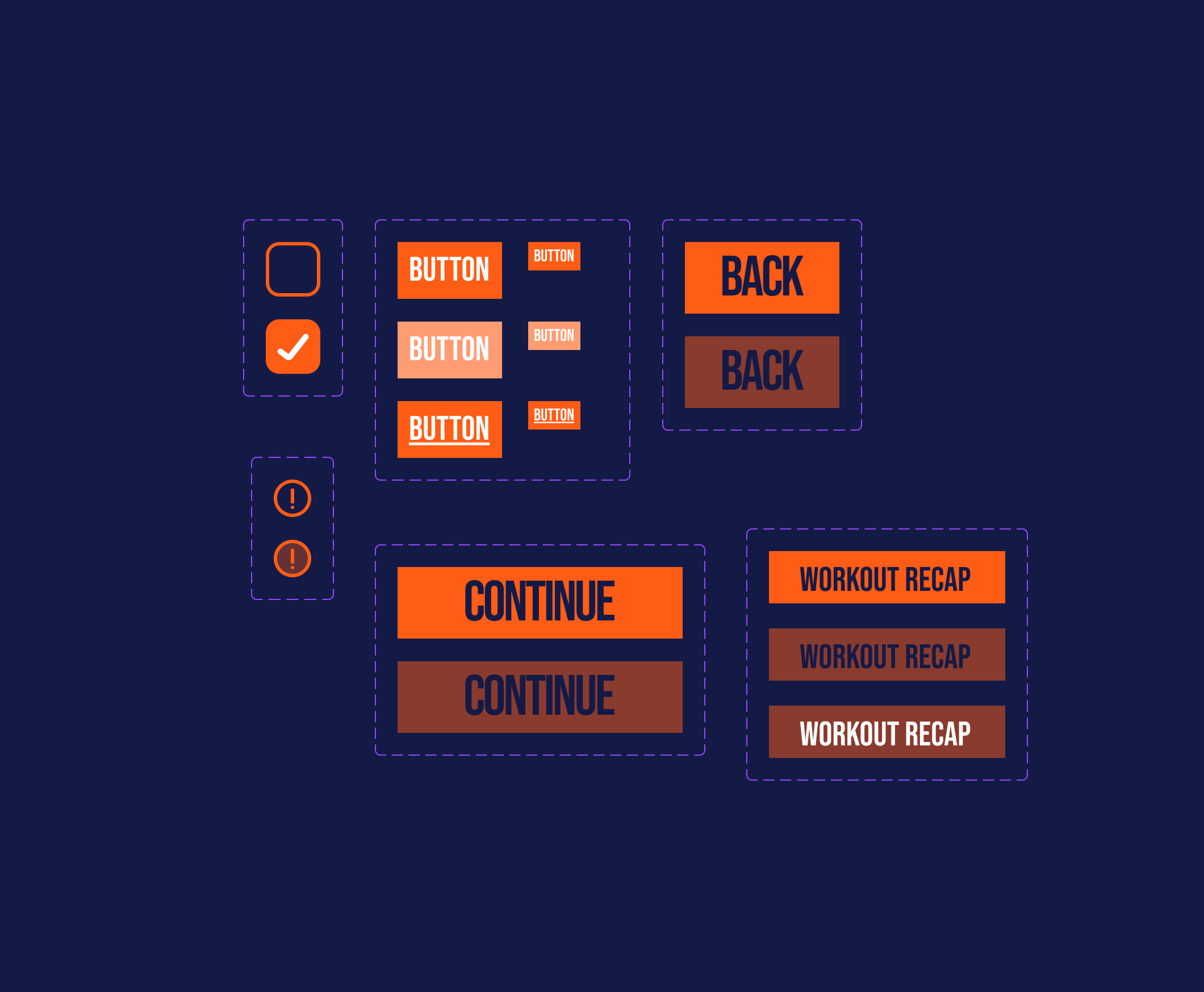 We made a colour hierarchy in our system adhering to the 60-30-10 rule with dark blue, orange, and white. We consistently applied these colour across the system to maintain uniformity and standards. We maintained the colours at approx. 60%, 30% and 10%, with the orange colour chosen to evoke familiarity to other fitness apps.