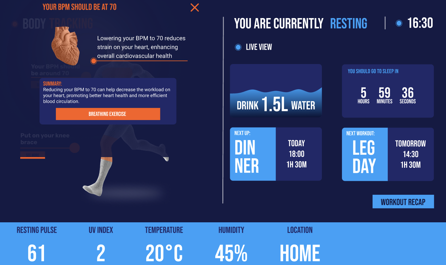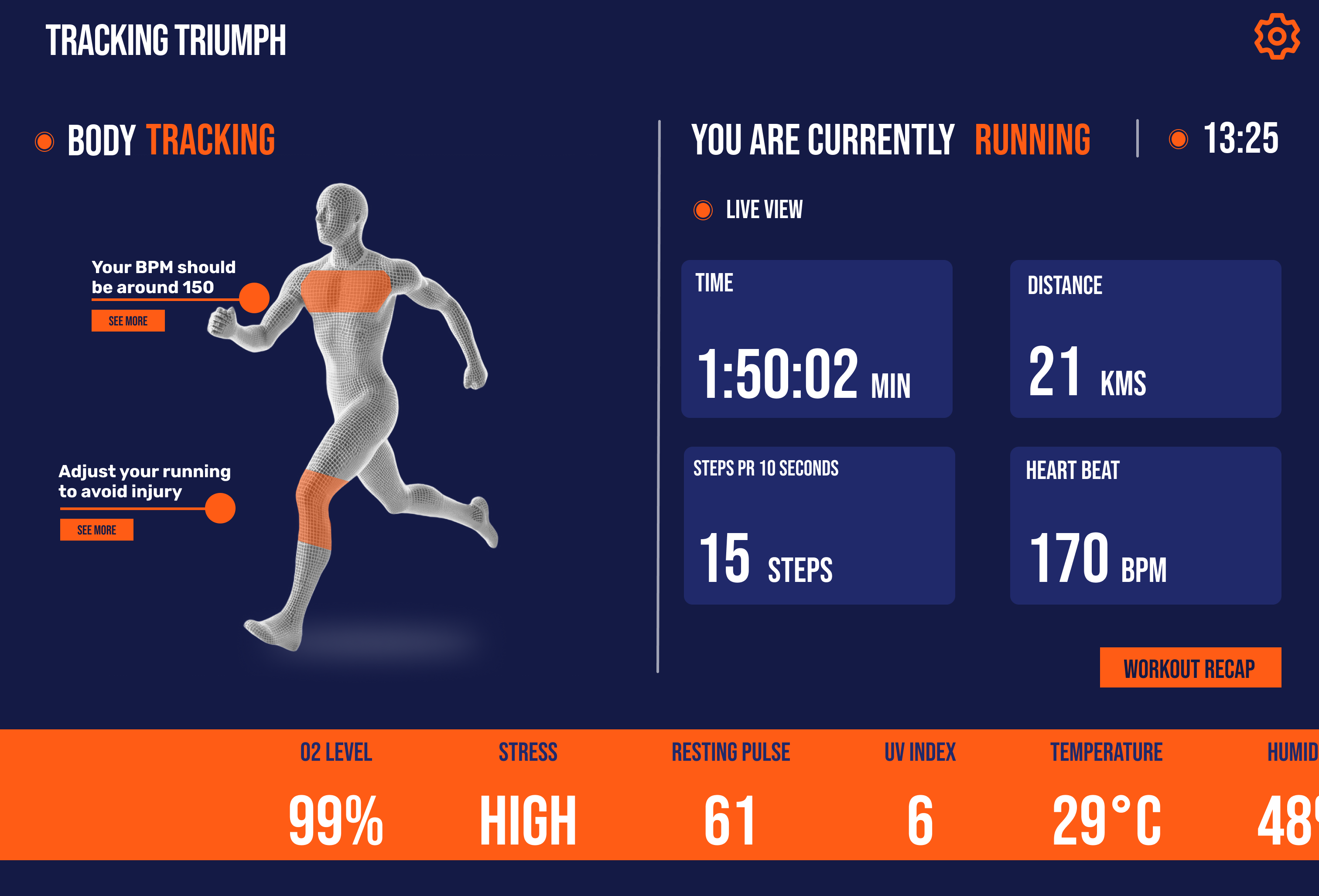 Tracking Triumph monitors the users workouts and provides visual feedback using the 3D model, offering tips and analytics based on your performance. Additionally, the system's sensors accurately track movements, alerting users to any actions that could lead to injuries.