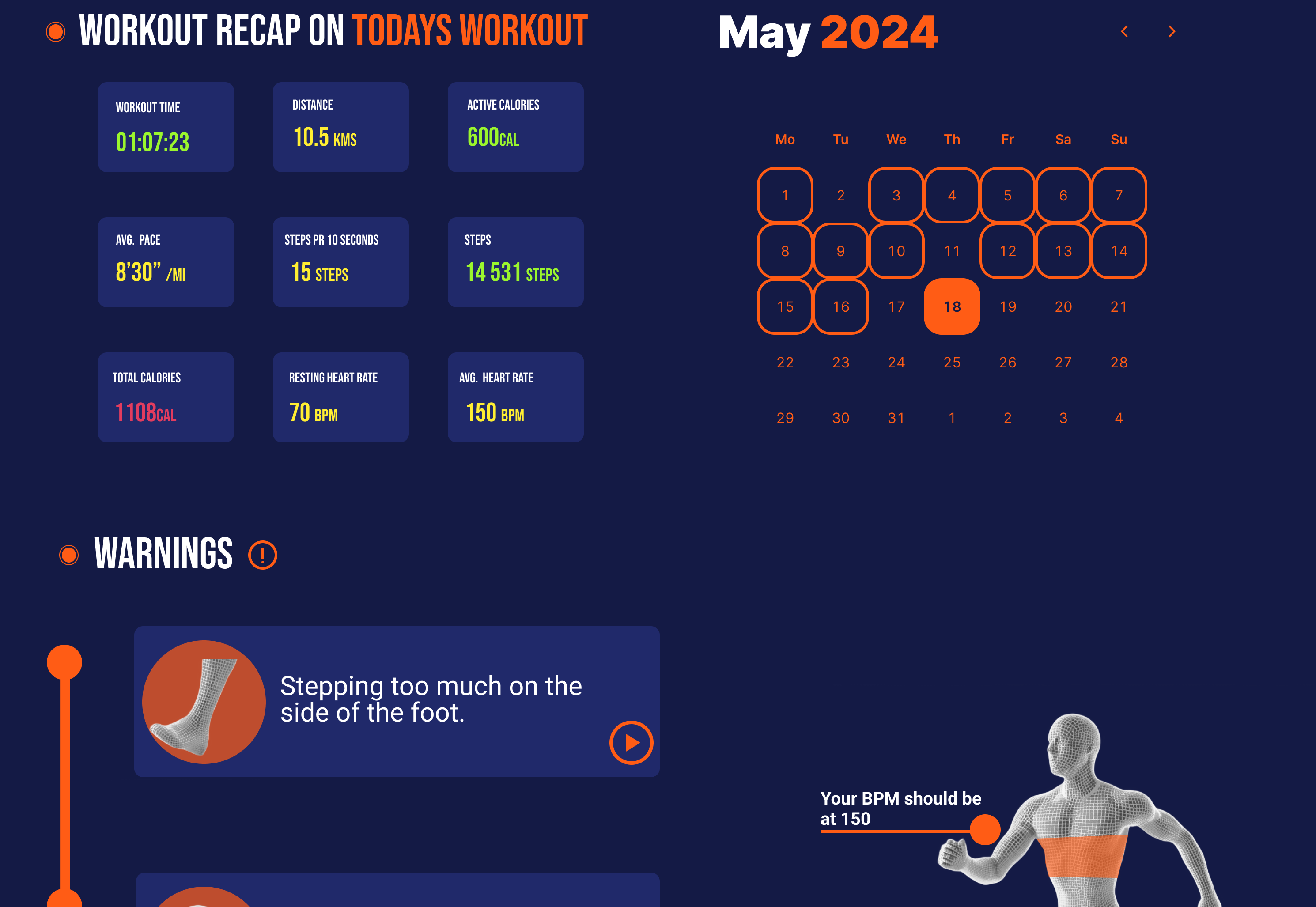 The prototype features a 3D representation of the user, displayed on the main page. It replays their movements in real-time and alerts them if any issues occur during a workout.