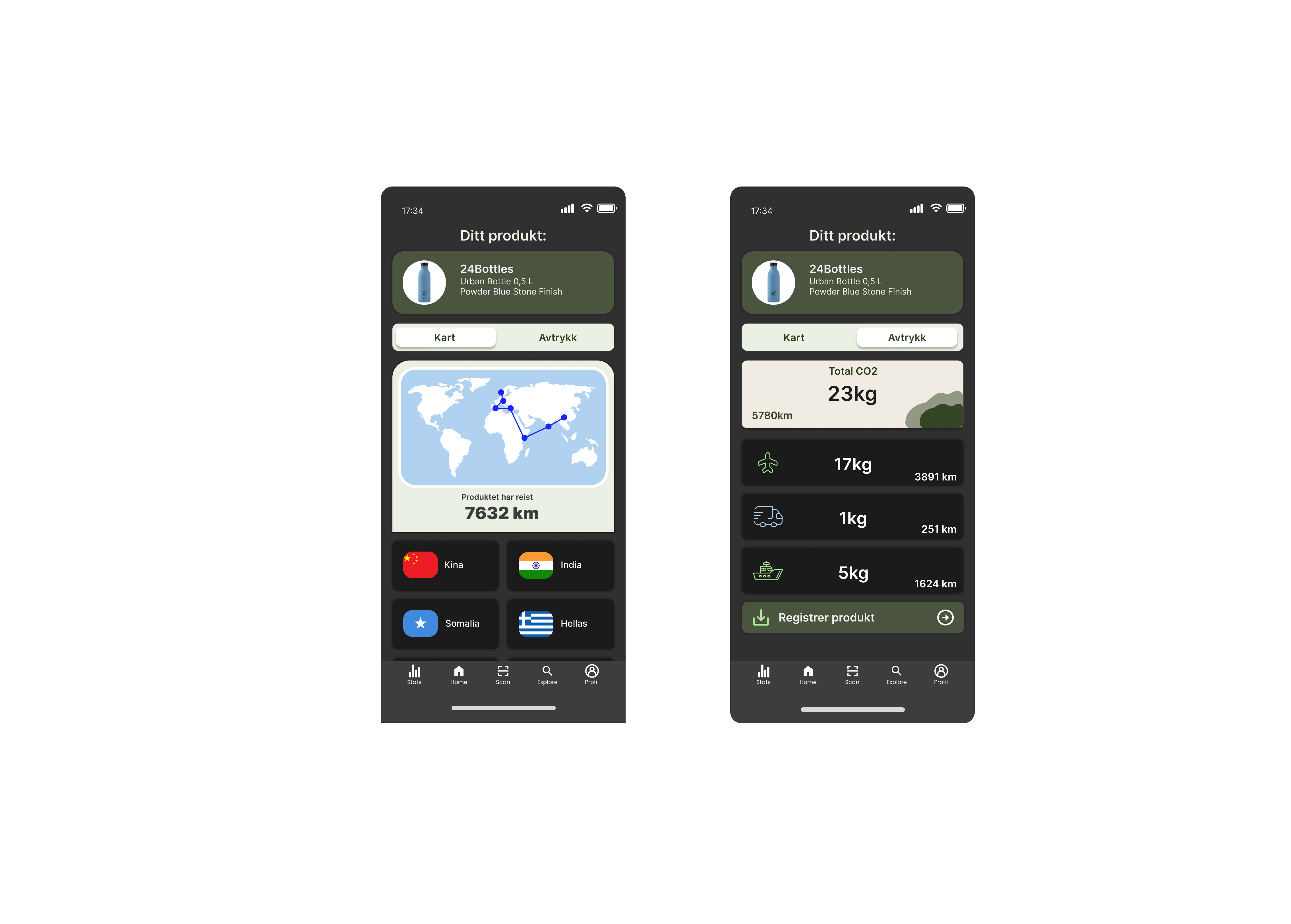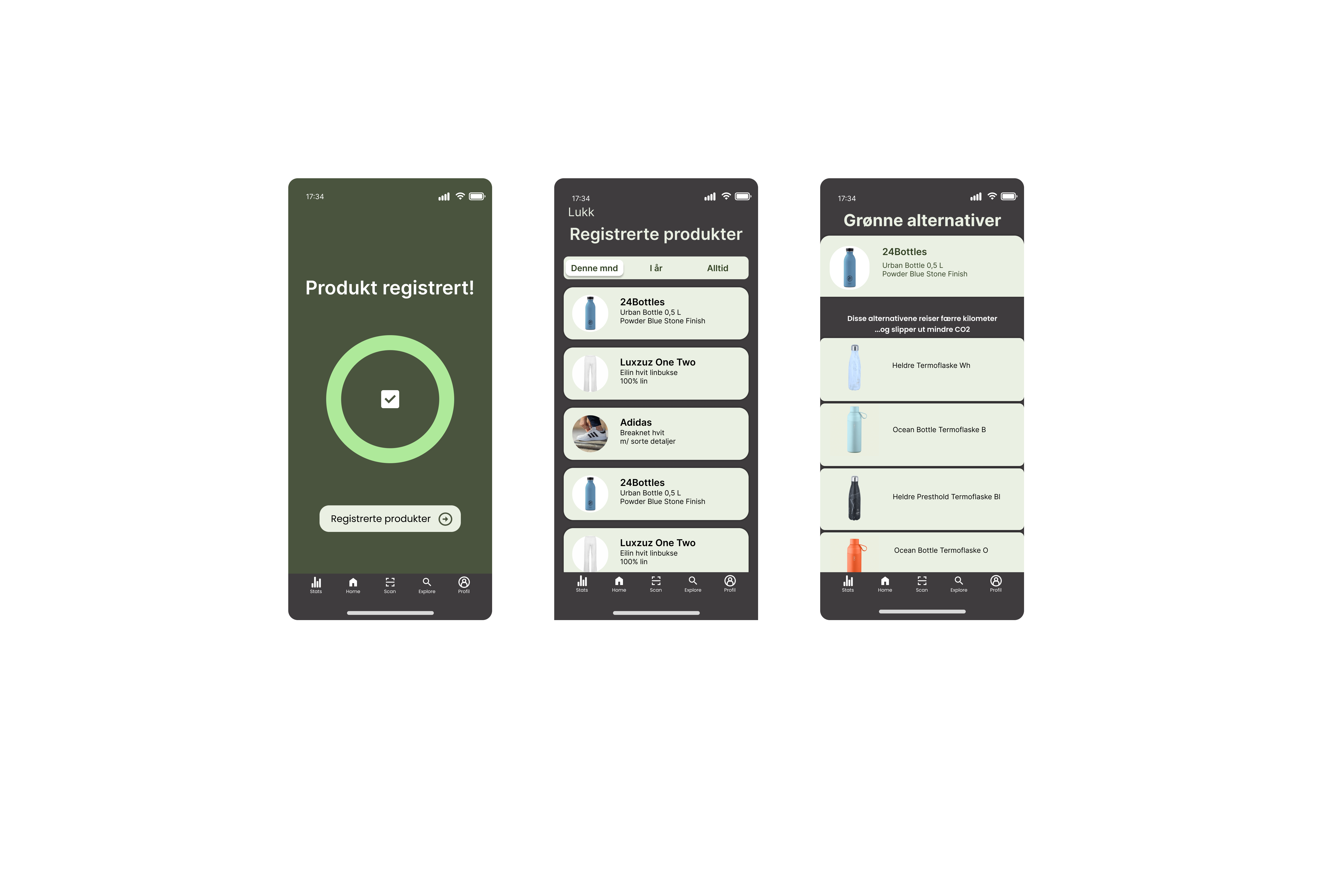 Option 1 takes the user to information about the product’s journey, where it has been, and the product’s climate footprint. Here, the user also has the option to register the product; in that case, the following screen will look the same as if the user had chosen Option 2. Option 2 registers the product, including information about its climate footprint, and adds the product to the user’s already registered product library. Option 3 allows the user to see greener alternatives.