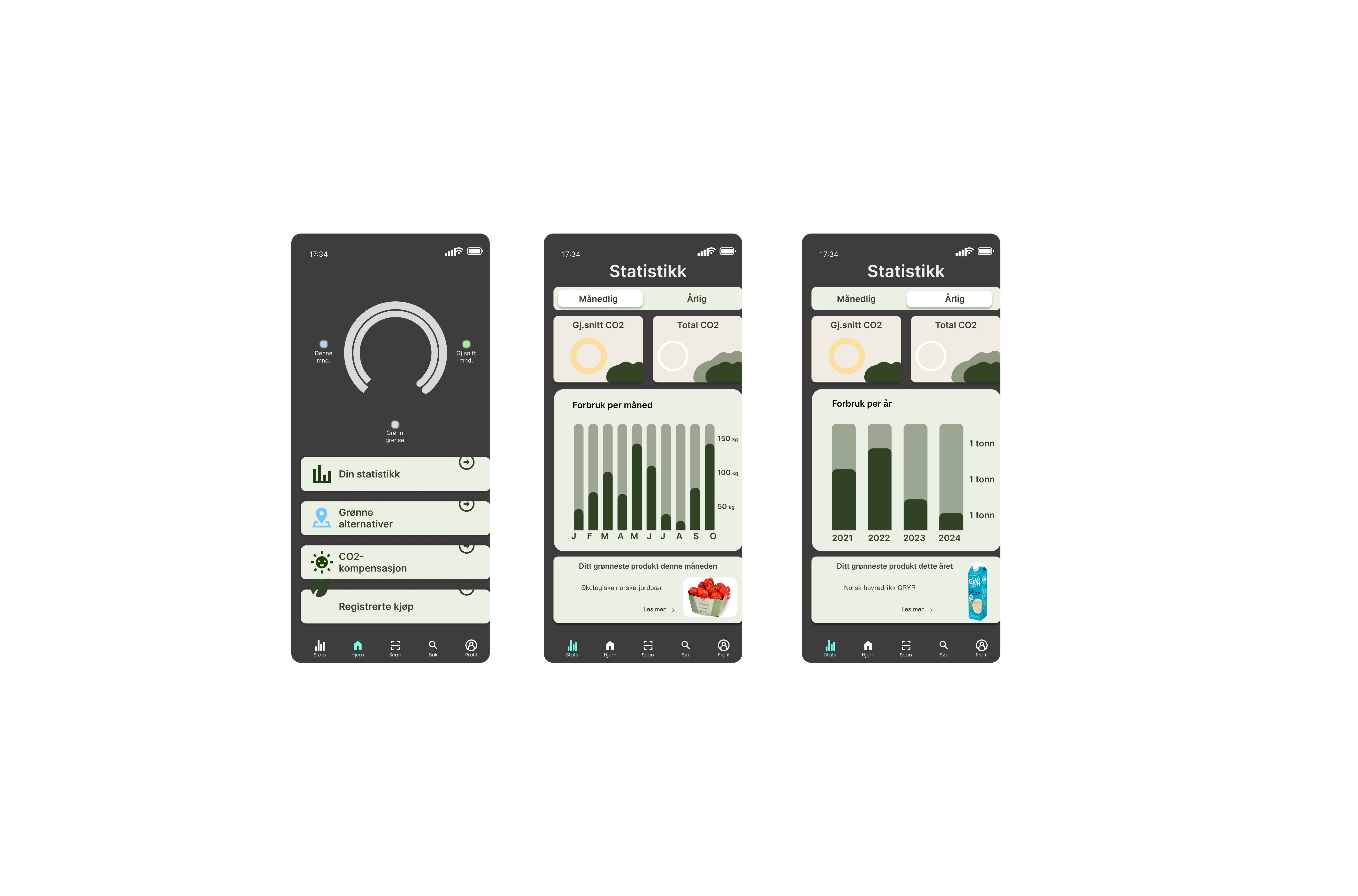 If the user clicks on ‘your statistics’ or selects ‘stats’ in the menu bar, the prototype takes them into the application’s statistics center. Here, they can view interesting statistics, both monthly and yearly. The user is also shown their greenest product, where they can click on ‘read more ->’ and be directed to the product’s information page outside the application. Colors can be seen as a consistent element throughout the entire design.