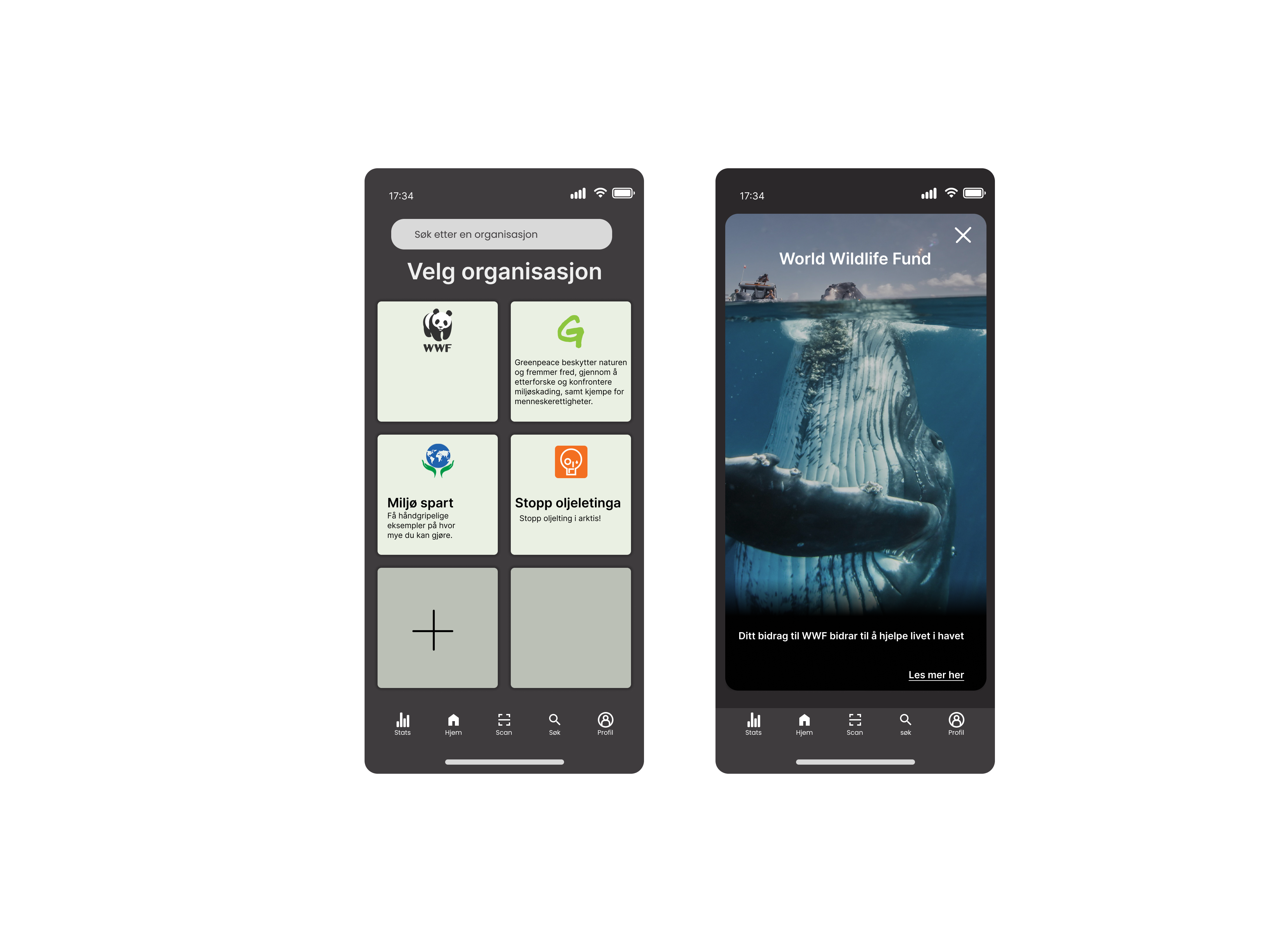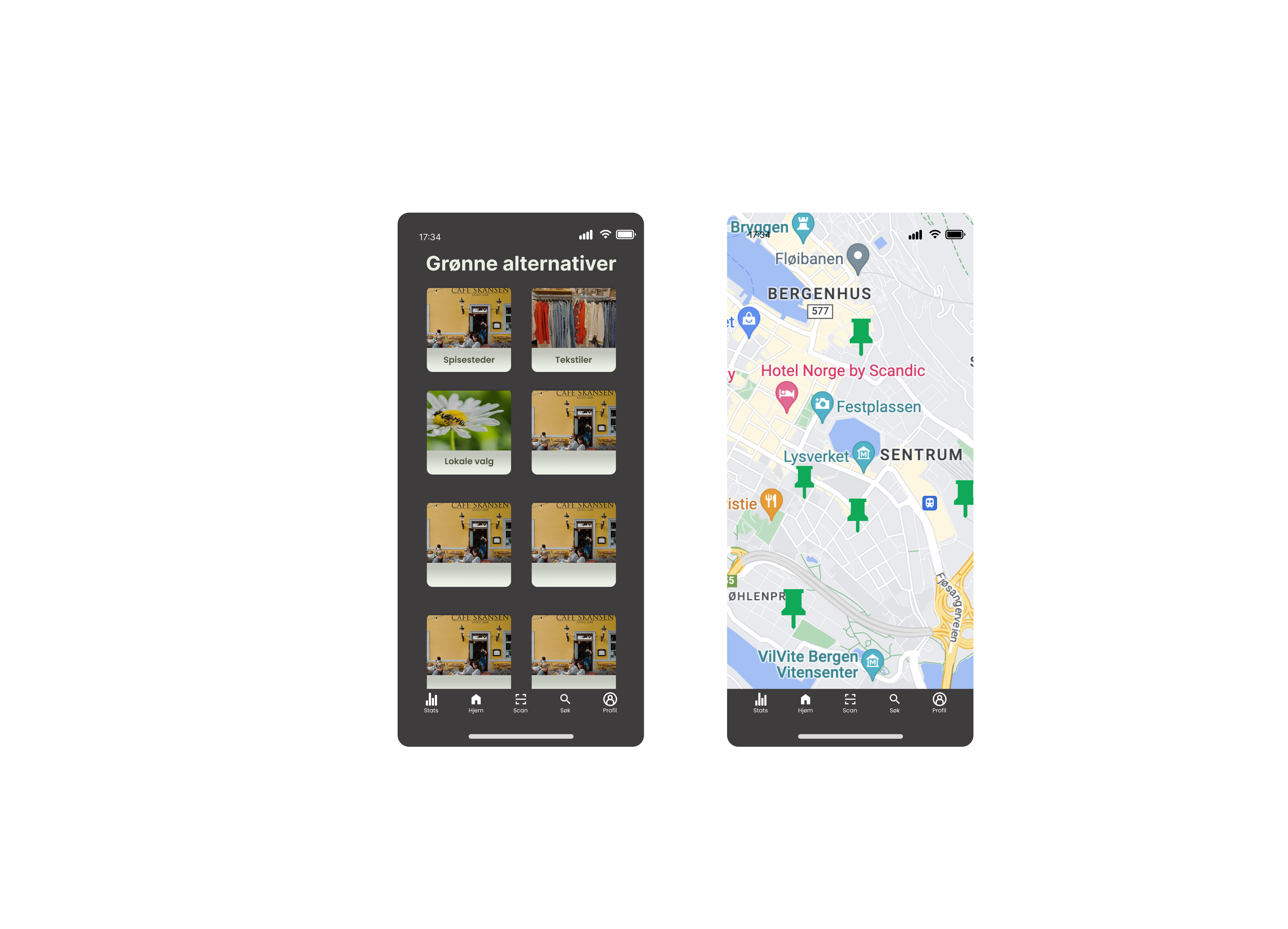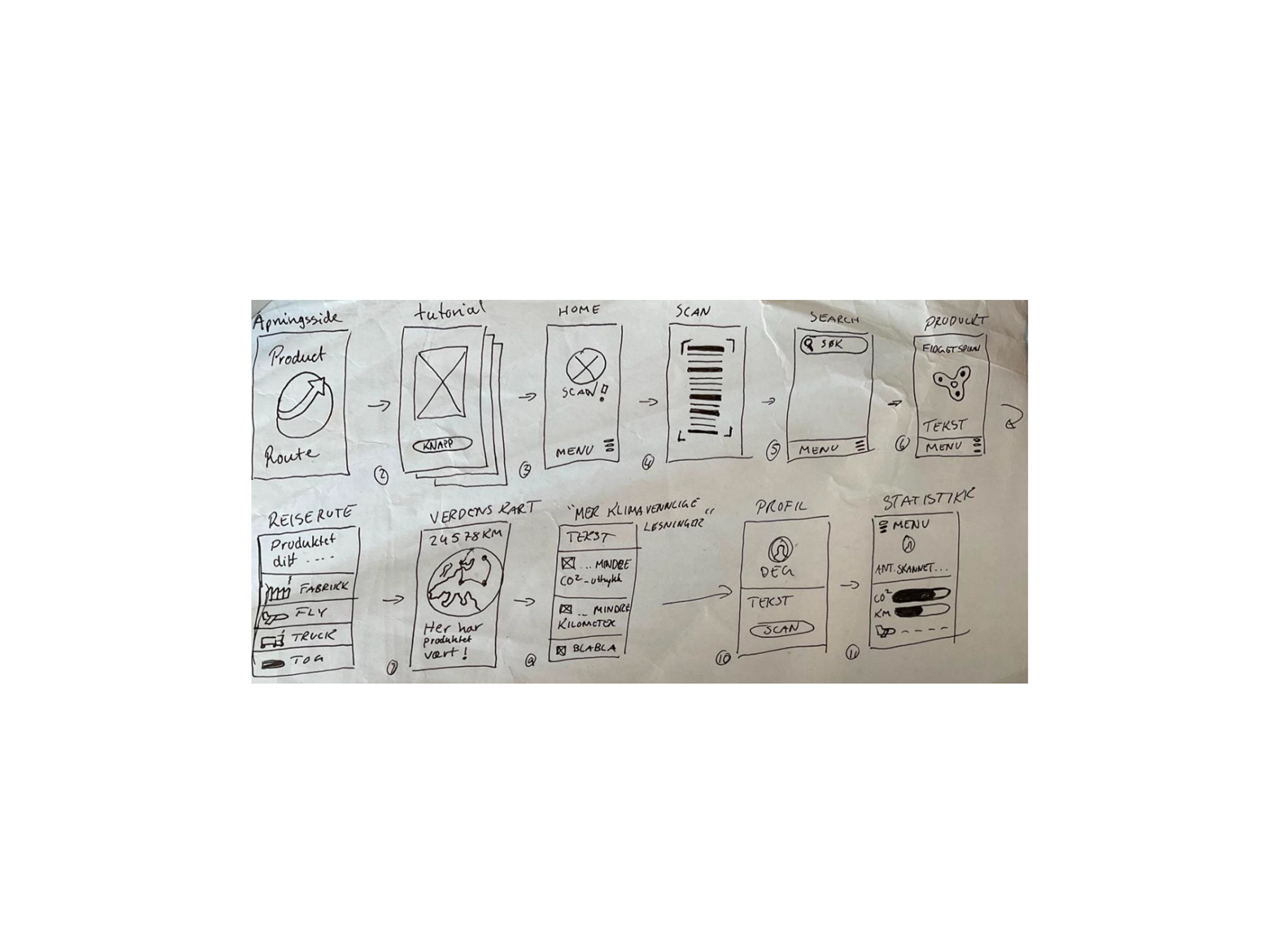 Semi-structured interviews were conducted to gather good data for the target group. From the interviews, it was clear that the age group was moderately or very conscious about the environment. Eight groups with 1–5 users participated in the workshop. This provided the design with valuable data from users who could discuss different solutions and design proposals. The design also received individual thoughts from participants who gave input independently, without influence from others. During the workshop, it became clear that the users wanted an app with easy access to the scanning function, a start page similar to that of the Shazam app, and a clean application with multiple features.