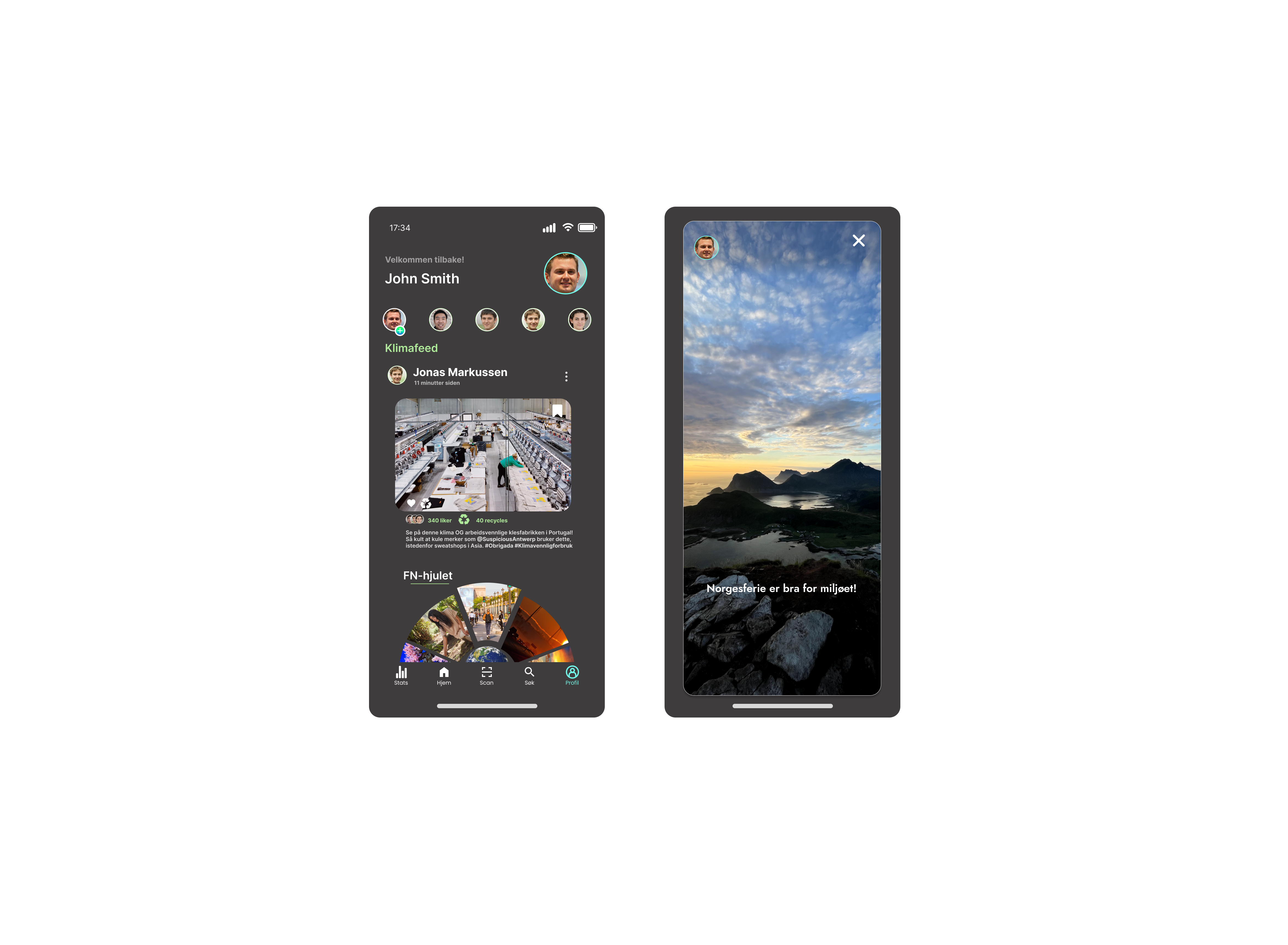 If the user clicks on ‘Green alternatives,’ they will be presented with several options for choosing greener. Since local choices were of particular interest among several workshop participants, the user can click on ‘Local choices’ and access a map showing local green alternatives, here represented by green pins. The green pins were suggested during the workshop. If the user clicks on ‘Profile’ in the menu bar, they are taken to their personal profile, where different climate-related topics can be shared. The user can also post and view others’ ‘stories’ here, functioning as a kind of small social medium for climate issues. The UN wheel can also be found in the profile, reminding the user that the application is intended to inform about and help achieve the UN’s climate goals. The wheel will contain news articles related to the themes shown in the images. This serves as a unique element that sets the application apart from others.
